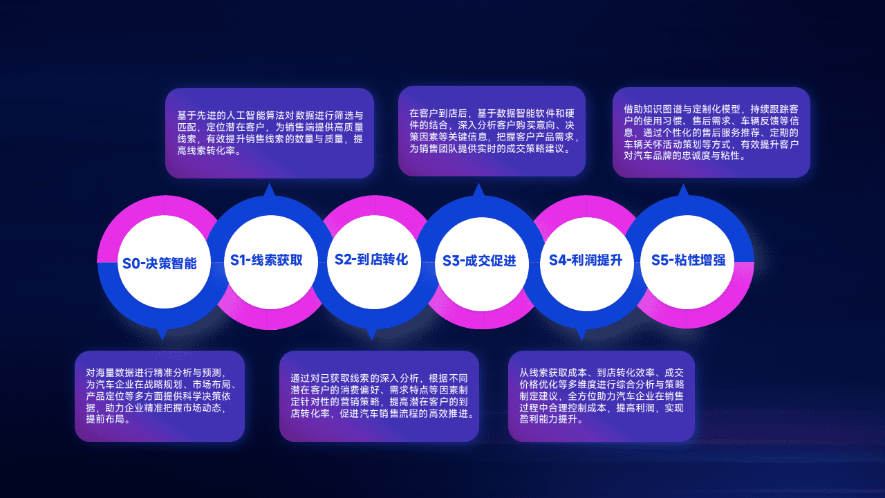 基于销售转化漏斗的薄弱环节,,为客户提供数据+模型+运营的智能应用,,,,实现销售业绩的提升;推动线索管理全链路的精细化管理和运营。。。